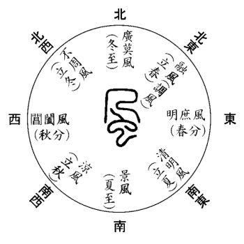 そこで、この8つの風についてもう少し詳しく調べてみます。清代の段玉裁という学者が書いた注釈書(『説文解字注』)を見ると、中国の古今のいろいろな書物から、8つの風に関する記述を引用しながら、『説文解字』の本文を解釈しています。段玉裁が付けた注釈の詳しい内容は省略しますが、それを見ると、8つの風それぞれの吹いてくる時季も明らかになります。