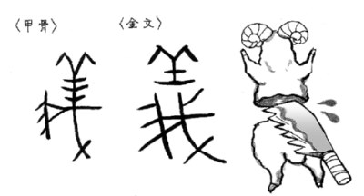 前回取り上げた「美」は、生贄としての羊の見事さを称える字でした。「義」の下部は鋸(のこぎり)のような刃物の形で、これでもって犠牲の羊を切り、外見だけでなく肉や内臓も供物として完全であることを示して、そこから「義」の字義は「よい」「正しい」の意味へとつながったということでした。