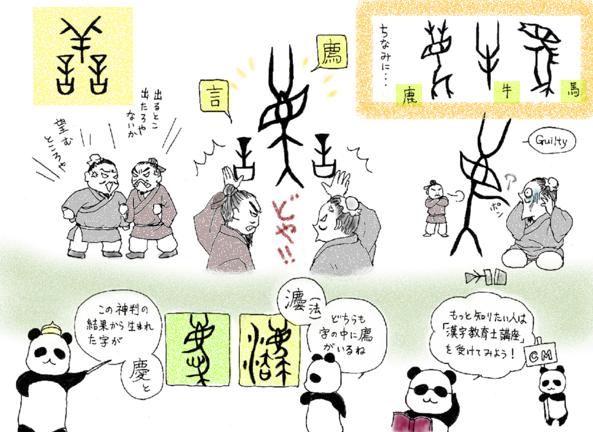 その「言」を左右に置かれた真中の羊は「解?」(カイタイ)又は「?豸」(カイチ)と呼ばれる神聖な羊で、善悪を見分ける力があるとされていました。後漢時代の字書『説文解字』には解?について、