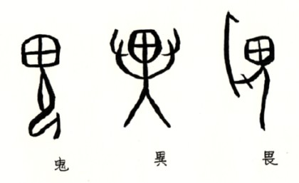『字統』で「鬼」の項を見ると、「鬼」に関係があると考えられる字の解釈を重ねた上で、「鬼とはもと人屍の風化したものを称する語であろう」と説明しています。古代文字を見れば、大きな頭部を持つ異形のモノがひざまずく姿です。この頭部は鬼面であるとも祖先の人骨であるとも……。