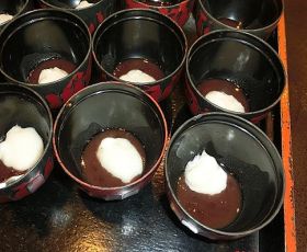 粒あんを使っていたら「小倉汁粉」または「田舎汁粉」、こしあんを使っていたら「御膳汁粉」と呼びます。「御膳(ごぜん)」とは、食品名の上に付けて上等であることを表すことばで、ここでは煮た豆をこして手をかけて作られる汁粉の意味です。